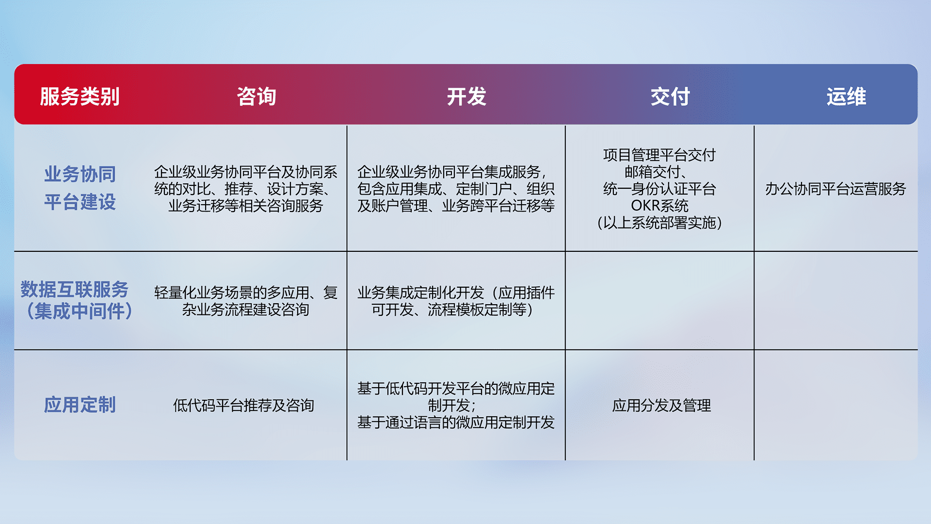 针对钉钉、、、、企微、、、、IDaas等平台级产品提供产品的规划、、、方案、、、交付、、、定制化开发等服务,,,实现如统一协同办公、、、智能客户服务、、、混合会议管理、、智能数据查询、、等业务场景,,,,实现数字化转型。。。。